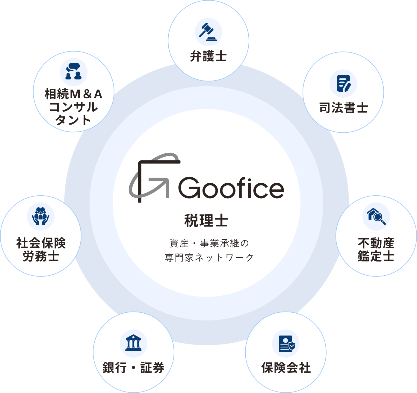 税理士を中心に、信頼できる弁護士・司法書士などの各分野の専門家や金融機関と連携し、ワンチームで対応します。